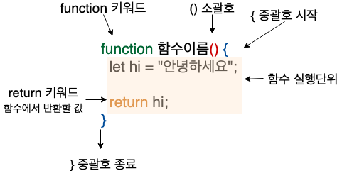 함수를 알리는 소괄호((): parentheses)를 열고 닫고 // (parameter로 데이처를 받을 수 있음)
